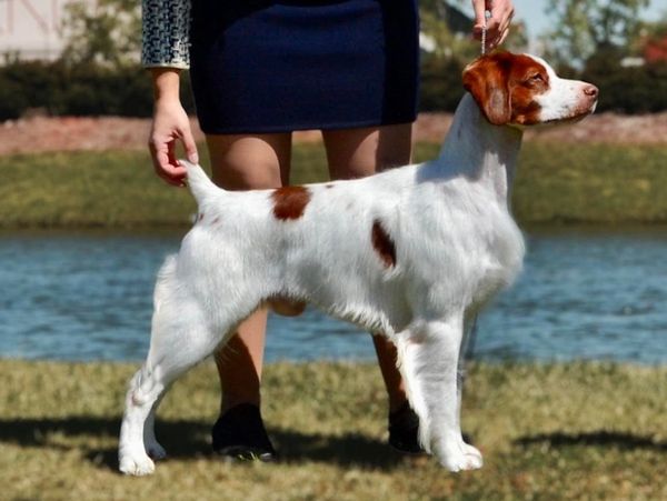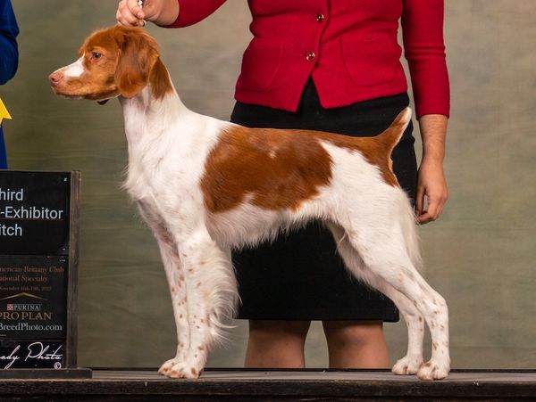 Winston finished his show championship quick and easy at 7 months old, winning Best of Breed over specials! And then he went into the field, where he earned his Senior Hunter easily. He has excellent drive and a nice shooting dog range. He is also biddable and a natural retriever (a trait which I want to keep!). In between field training, he also hit the show ring again and finished his Grand Championship, along with an Owner Handler group placement! At the 2023 Brittany National, I was honored to get to show Winston in Best of Breed. While we weren't the judges pick, Winston showed beautifully and his HUGE side gait made me realize I'm going to have to learn to take big strides to keep up with him!